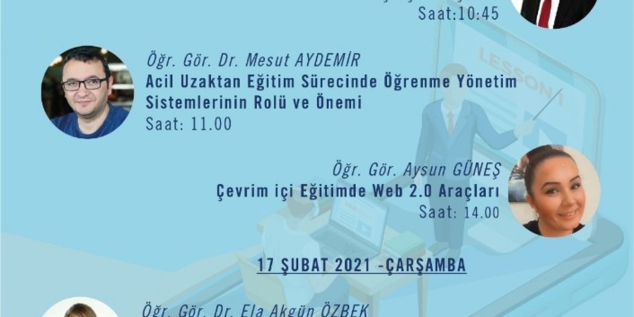 Anadolu Üniversitesi Rektörü Prof. Dr. Fuat Erdal'ın açılış konuşmasını yapacağı seminerde; Öğr. Gör. Dr. Mesut Aydemir "Acil Uzaktan Eğitim Sürecinde Öğrenme Yönetim Sistemlerinin Rolü ve Önemi", Öğr. Gör. Aysun Güneş "Çevrimiçi Eğitimde Web 2.0 Araçları", Öğr. Gör. Dr. Ela Akgün Özbek "Tasarımdan Uygulamaya Uzaktan Eğitim ve Dijitalleştirilmiş Öğrenme Süreçleri", Öğr. Gör. Dr. Erdem Eroğlu "Çevrimiçi Belge Yönetim" konularında sunumlar gerçekleştirecek.