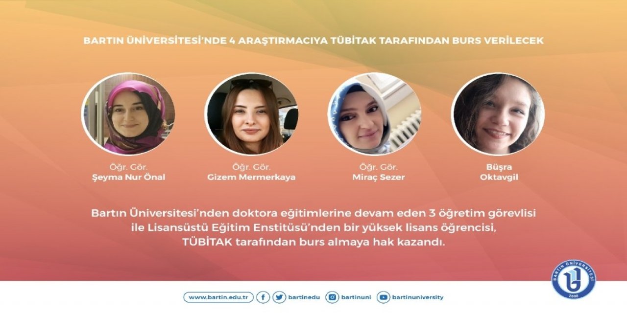 Bartın Üniversitesi'nden doktora eğitimlerine devam eden 3 öğretim görevlisi ile Lisansüstü Eğitim Enstitüsü'nden bir yüksek lisans öğrencisi, TÜBİTAK tarafından burs almaya hak kazandı.