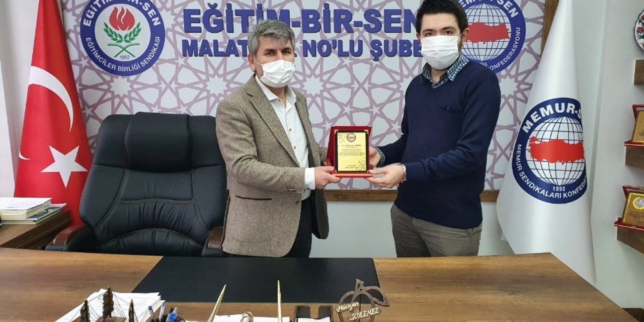 Memur Sen Malatya Temsilcisi ve Eğitim Bir Sen Malatya 1 nolu Şube Başkanı Hüseyin Söylemez, Genç Memur Sen Malatya İl Başkan Yardımcısı Muhammed Karmış'a Malatya ve tüm ilçelerinin sosyal medya hesaplarının Türkiye'de ilk olarak tamamlanmasından dolayı plaket takdim etti.