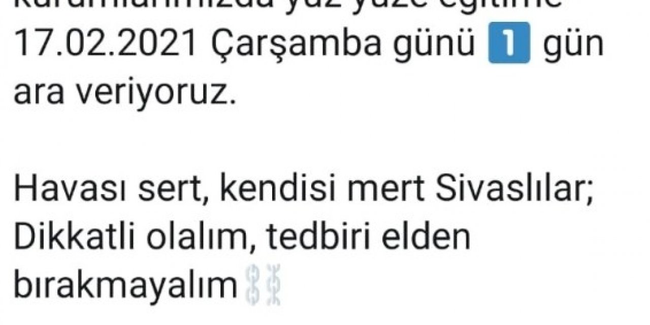 Sivas Valisi Salih Ayhan, sosyal medya üzerinden yaptığı paylaşımda, "Nihayet kış kendini yeniden hatırlattı. Yoğun kar yağışı, fırtına devam ediyor. Sivas genelinde bütün eğitim kurumlarımızda yüz yüze eğitime 17 Şubat 2021 Çarşamba günü 1 gün ara veriyoruz. Havası sert, kendisi mert Sivaslılar; dikkatli olalım, tedbiri elden bırakmayalım" ifadelerine yer verdi.
