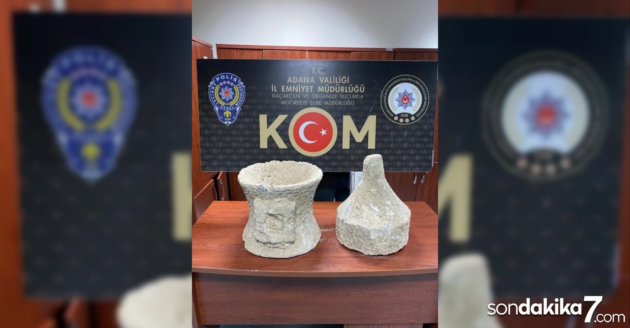 Adana’da polisin şüphelenip durduğu otomobilde tarihi olduğu değerlendirilen 2 taş eser ele geçirildi.