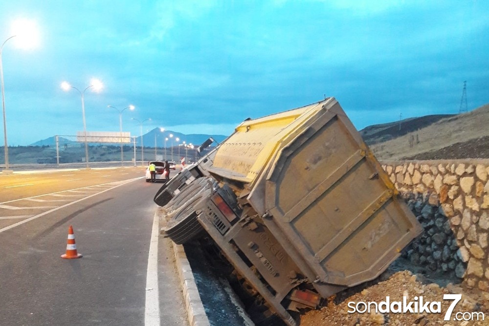 Edinilen bilgiye göre kaza, sabah saatlerinde Kahramanmaraş-Göksun karayolu üzerinde meydana geldi. A.C. idaresindeki 46 P 9050 plakalı kamyon, Göksun ilçesi istikametine seyir halindeyken direksiyon hakimiyetini kaybederek bordür taşlarına çarptıktan sonra yan yattı. İhbar üzerine olay yerine gelen sağlık görevlileri kamyon sürücüsü A.C’ye ilk müdahaleyi yaptıktan sonra hastaneye kaldırdı. Yol dışında kalan kamyon çekici marifetiyle kurtarıldı.Kaynak: İHA
