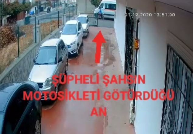 Güvenlik kamerası görüntülerinde hırsızın motosikleti sürükleyerek götürdüğü anlar yer alıyor.