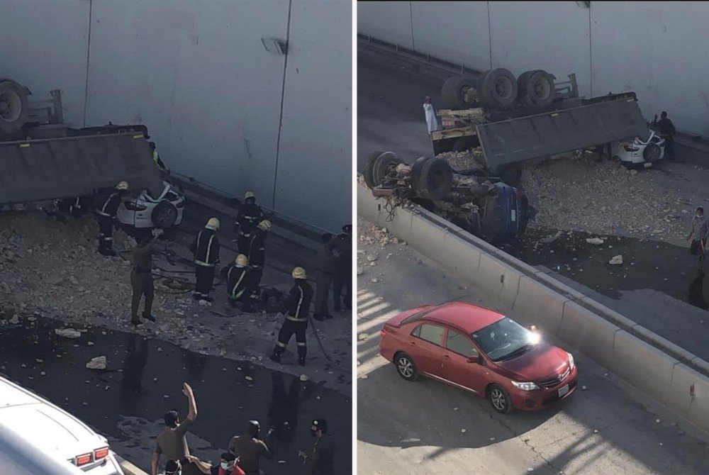 Suudi Arabistan'da kontrolden çıkan kum yüklü bir kamyon, köprüden uçarak seyir halindeki aracın üzerine düştü.