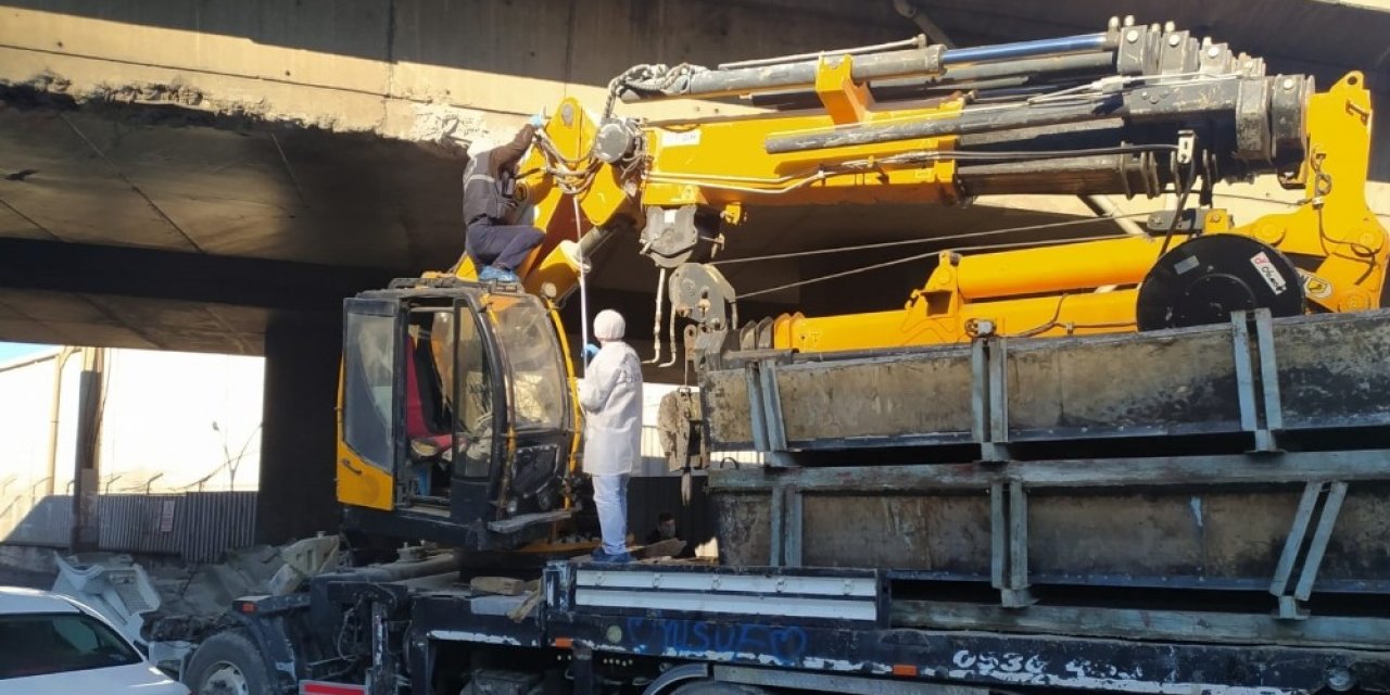 Trabzon’da vinç viyadüğe takıldı sürücü yaralandı