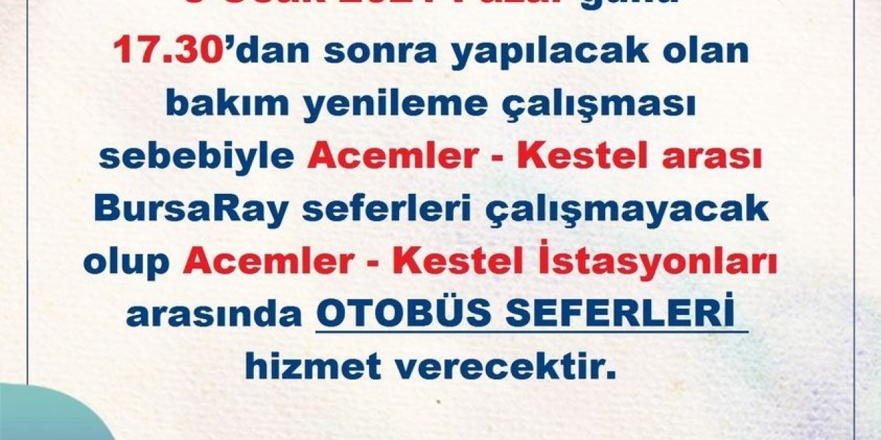 BURULAŞ sosyal medya ve internet sitesinden konuyla ilgili yaptığı açıklama da "3 Ocak 2021 Pazar günü 17.30'dan sonra yapılacak olan bakım yenileme çalışması sebebiyle Acemler - Kestel arası Bursa Ray seferleri çalışmayacak olup Acemler - Kestel İstasyonları arasında otobüs seferleri hizmet verecektir." denildi.
